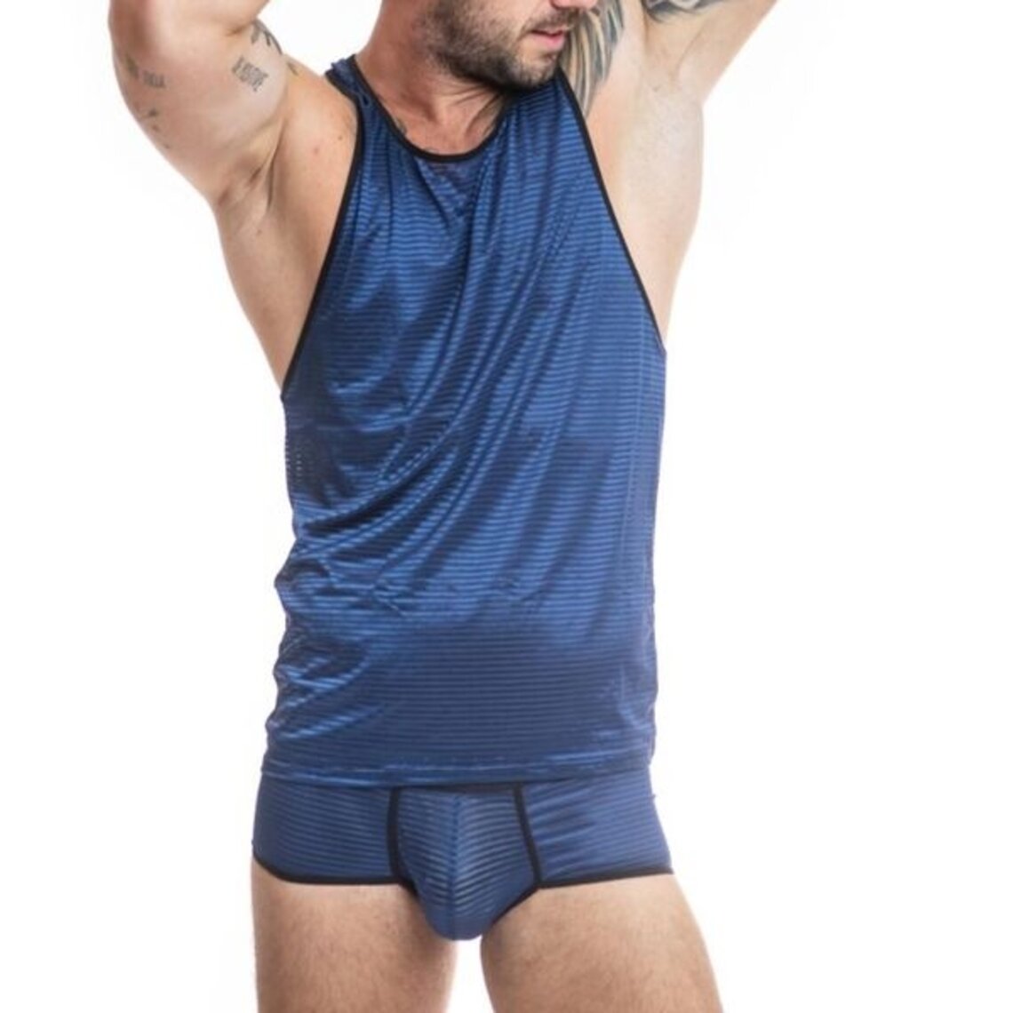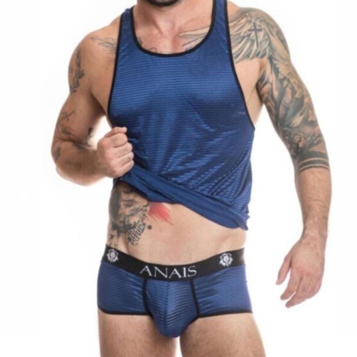 NAVALTul negro en azul marino, rayas verticales de rasoCaracterísticas  Camiseta de tirantes Estilo clásico Ajuste perfecto al cuerpoComposición 94% poliamida 6% elastánAnais Apparel la lencería más sexy del mundo desde 2003
