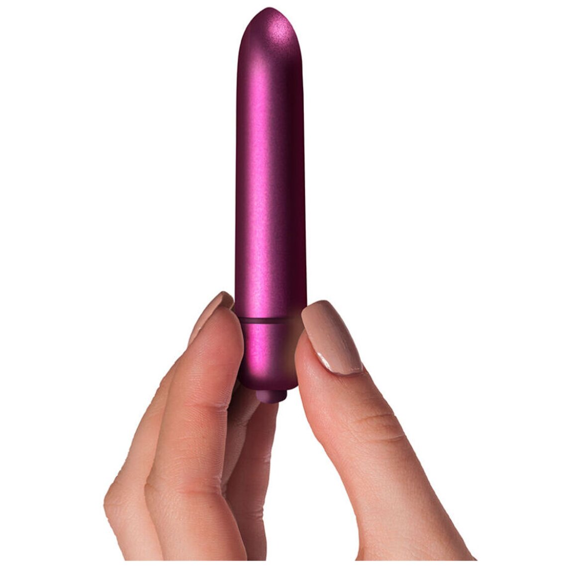 Mini vibrador bala de color rosa metalizado. Tiene 9 cm de longitud y es resistente al agua.