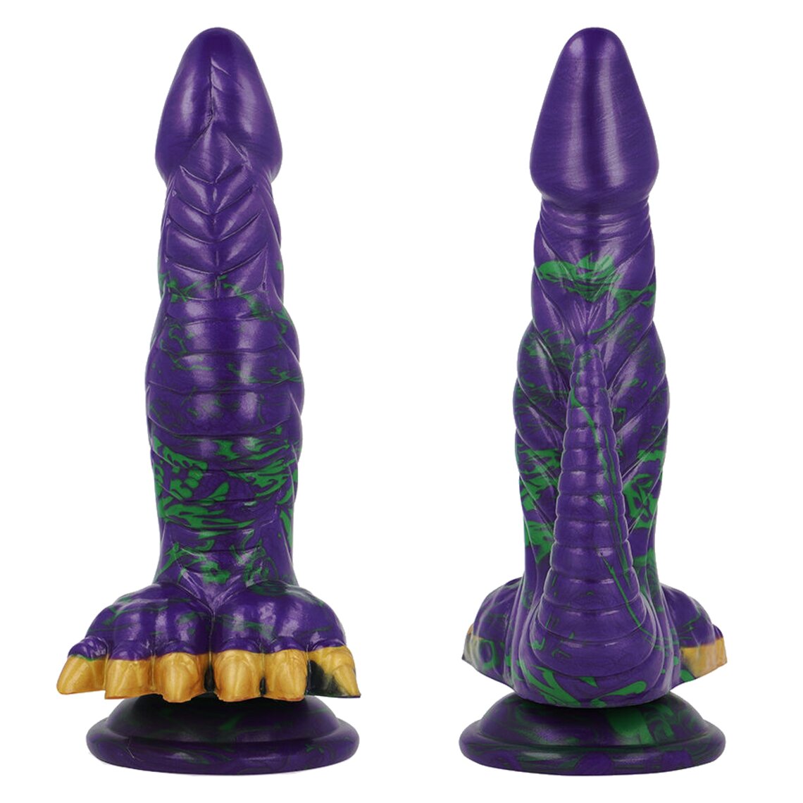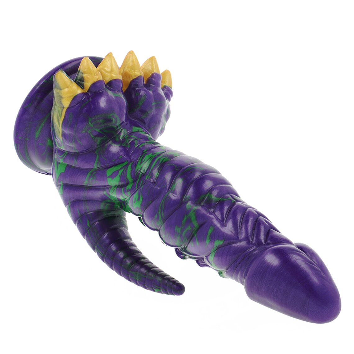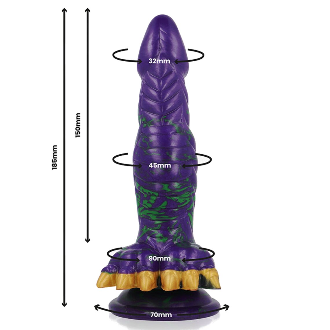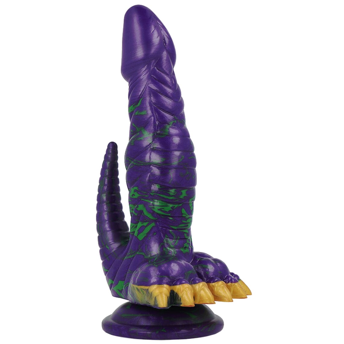 Dildo de fantasía de color índigo inspirado en un monstruo con patas y cola. 18,5 cm de alto.