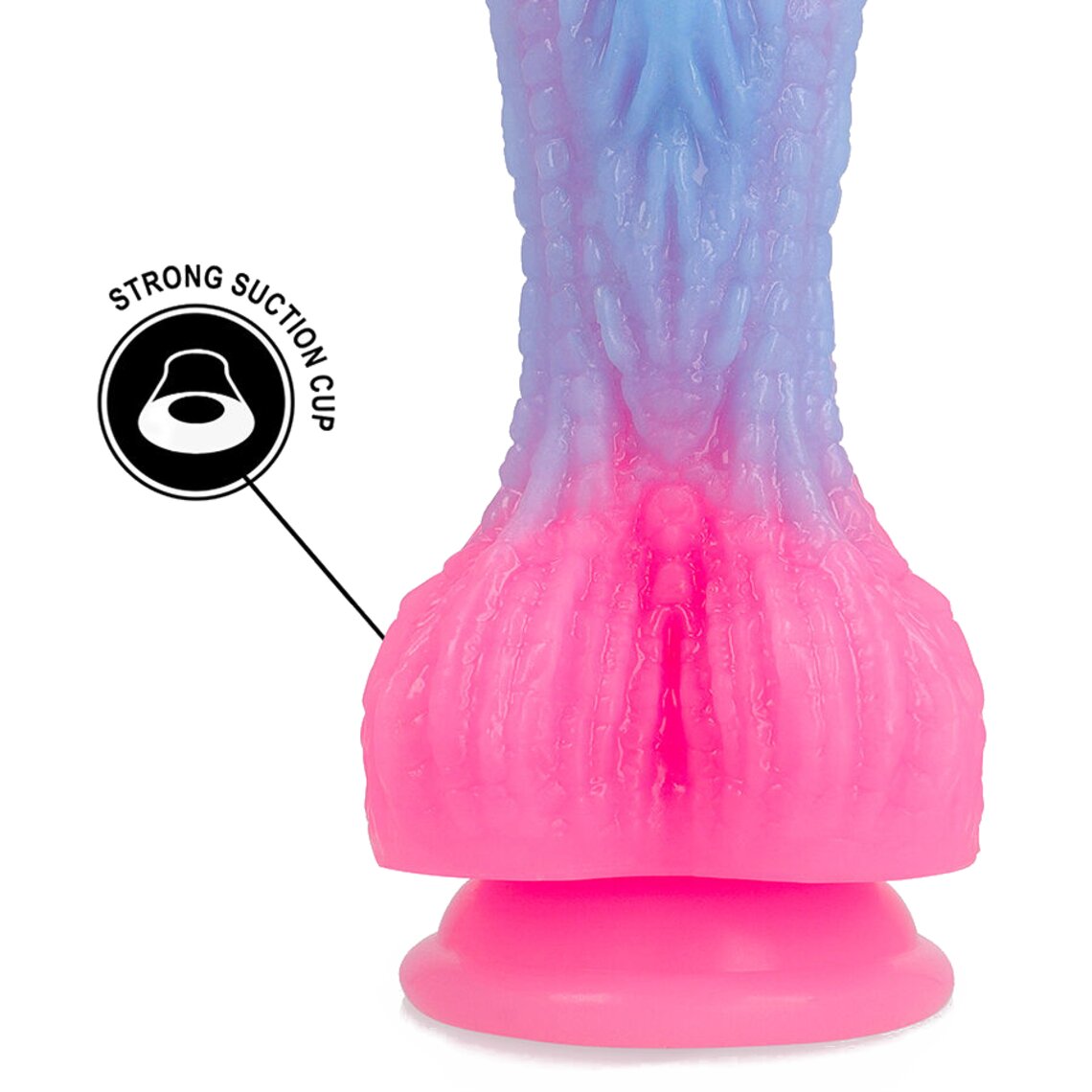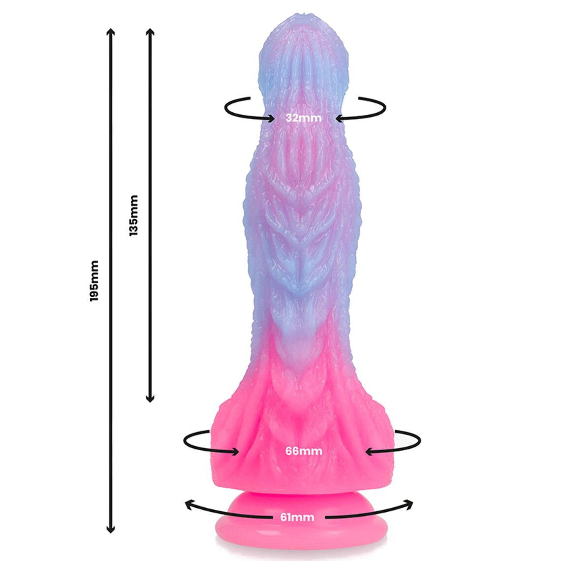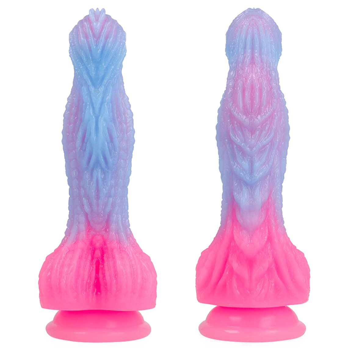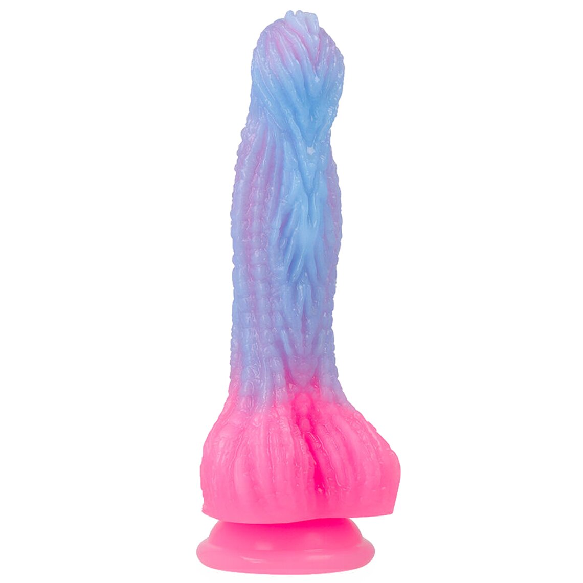 Dildo grande de fantasía inspirado en el amanecer. 19,5 cm de alto. Color azul claro y rosa.