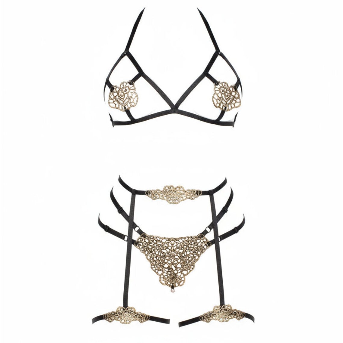 Cautiva con el Conjunto 'After Dark' de Sujetador, Tanga y Arnés de Liguero, un atrevido set de tres piezas diseñado para seducir. Con lujosos detalles bordados dorados, incluye un sujetador ajustable con tiras, una tanga de perlas que aporta un toque travieso y un arnés de liguero a juego que completa un look totalmente irresistible