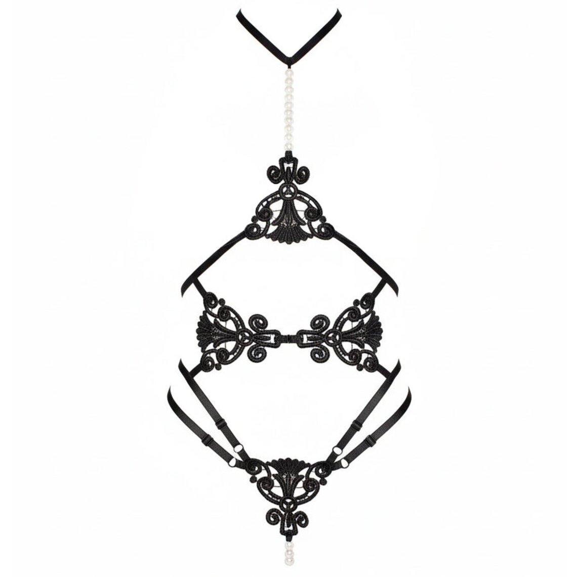 Body erótico de tiras negras con detalles de encaje y perlas decorativas.