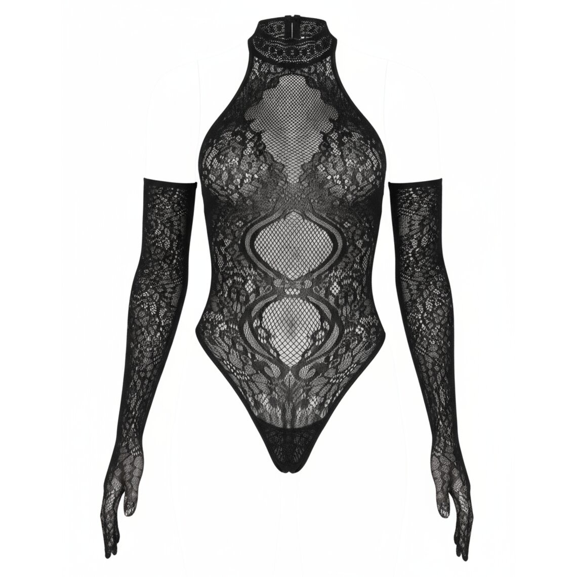 Elegante body negro de rejilla con cuello ajustado y guantes largos a juego.