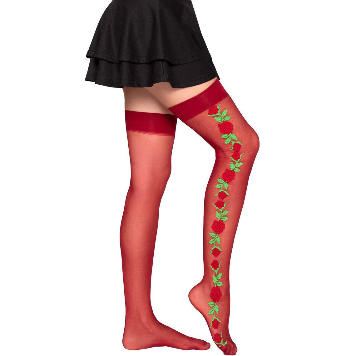 Añade un toque romántico con las Medias Borgoña Transparentes con Bordado de Rosas Laterales. Confeccionadas con una lujosa mezcla de spandex, ofrecen un ajuste suave y elástico con un sutil brillo. Las rosas bordadas en rojo y verde aportan un aire coqueto y femenino, convirtiéndolas en el detalle perfecto para completar cualquier look atrevido y juguetón.