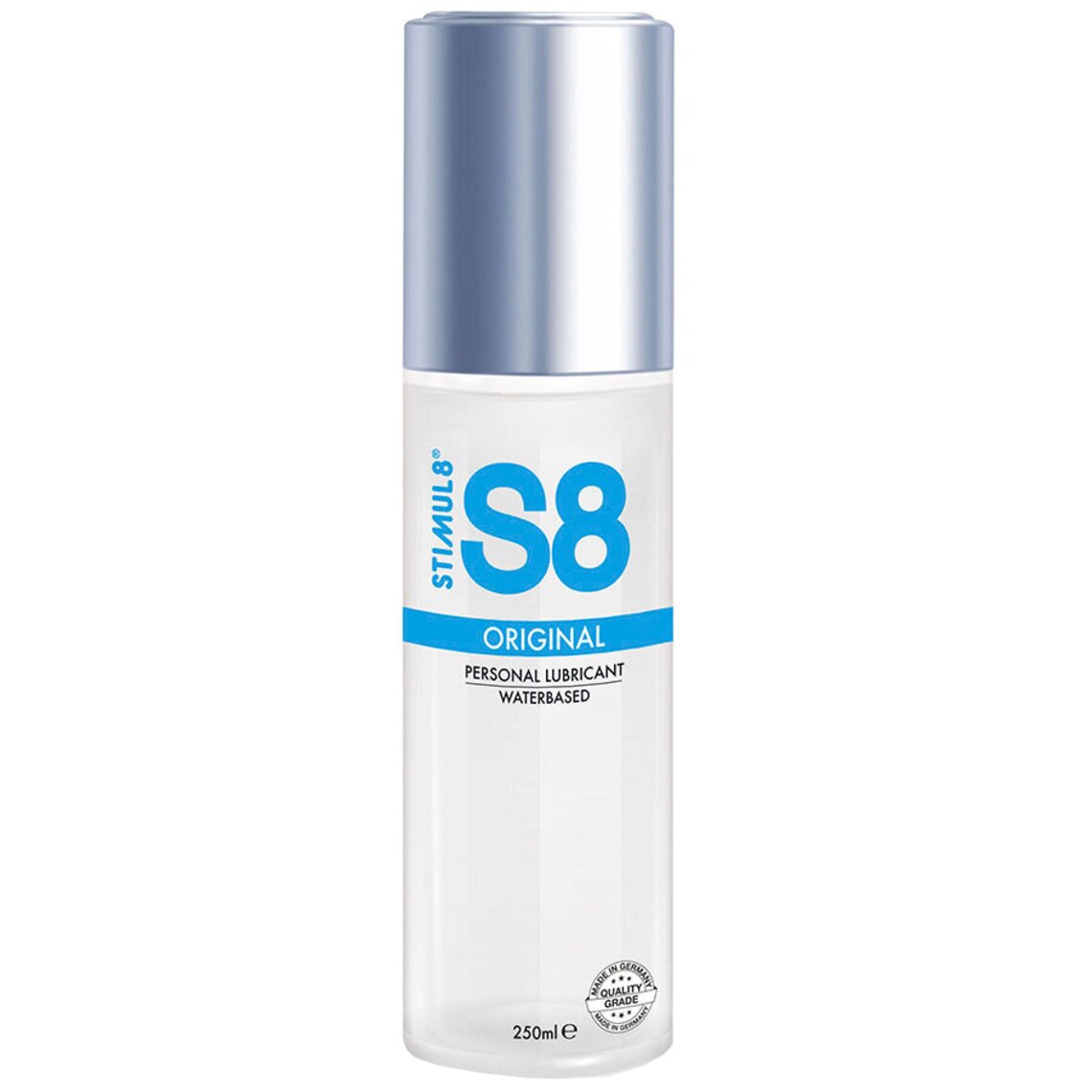 El lubricante original premium Waterbase de S8 es la solución perfecta para quienes buscan un lubricante de calidad y seguro para el cuerpo que mejore la intimidad y facilite sus encuentros íntimos. Esta fantástica fórmula de larga duración de S8 no contiene parabenos, ftalatos, gluten ni sulfatos, ni colorantes ni conservantes agresivos, lo que le confiere un atractivo irresistiblemente natural. El lubricante original a base de agua S8 cumple con todas las normativas vigentes de la UE en materia de productos para el cuidado íntimo y ofrece una alternativa fiable, transparente y con un precio competitivo frente a otras opciones no homologadas del mercado.