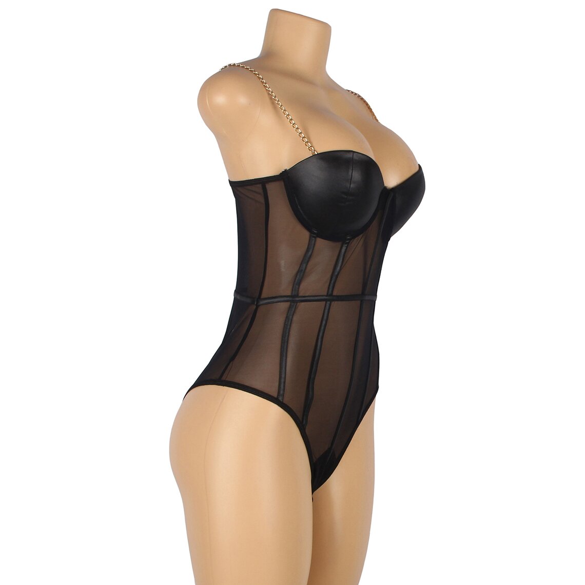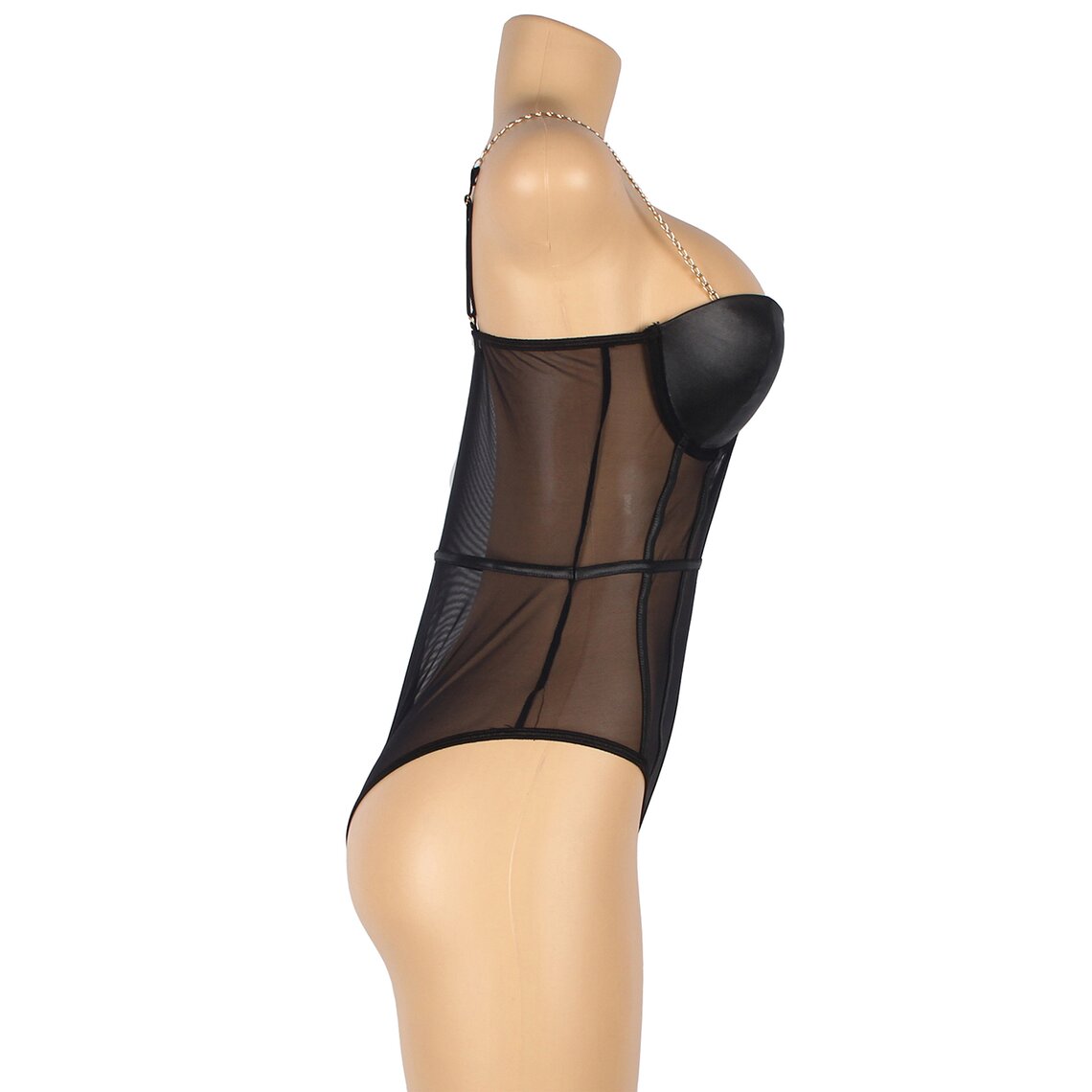 Body sensual para mujer en color negro. Las copas del sujetador son opacas y el resto del body tiene transparencias. Con cadenas doradas para tus hombros.