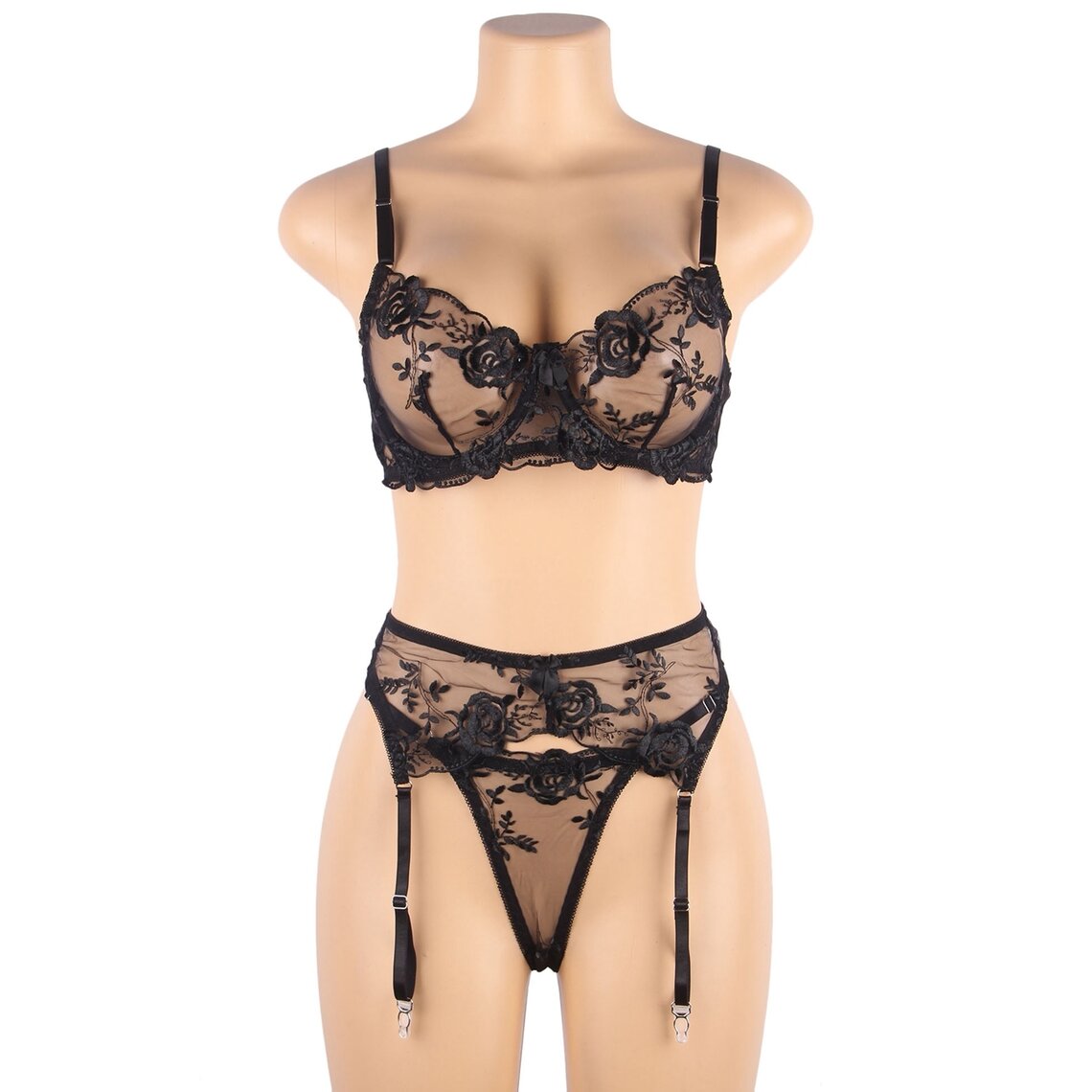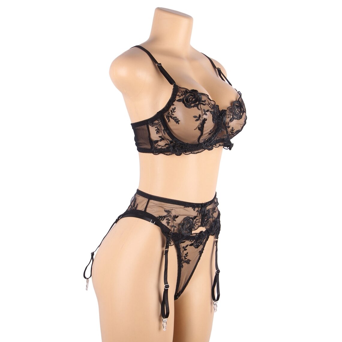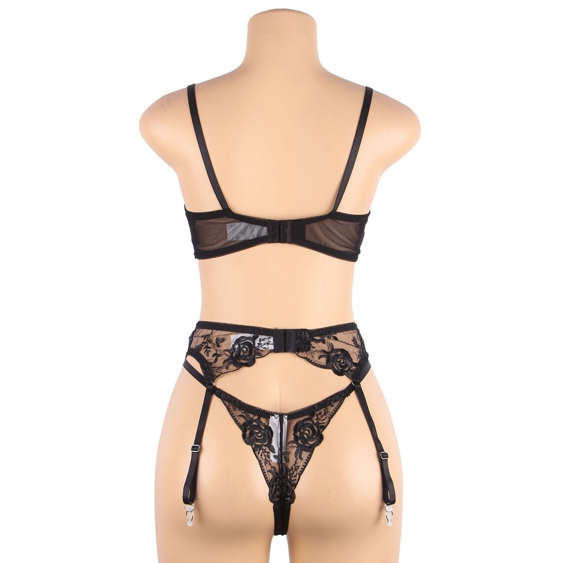Conjunto de lencería sexy con color negro compuesto por 3 piezas (sujetador, tanga y liguero). Detalles decorativos de encaje con flores.