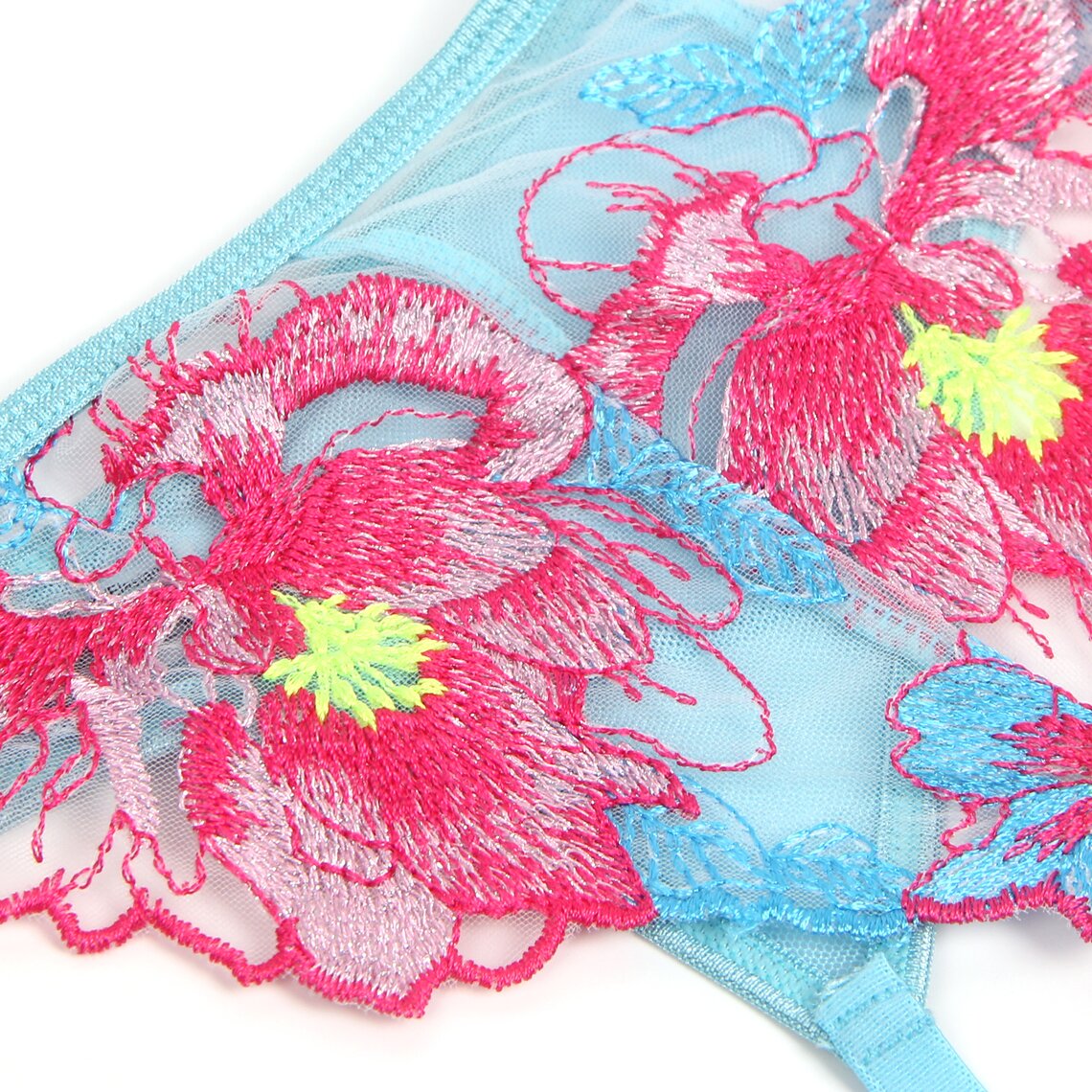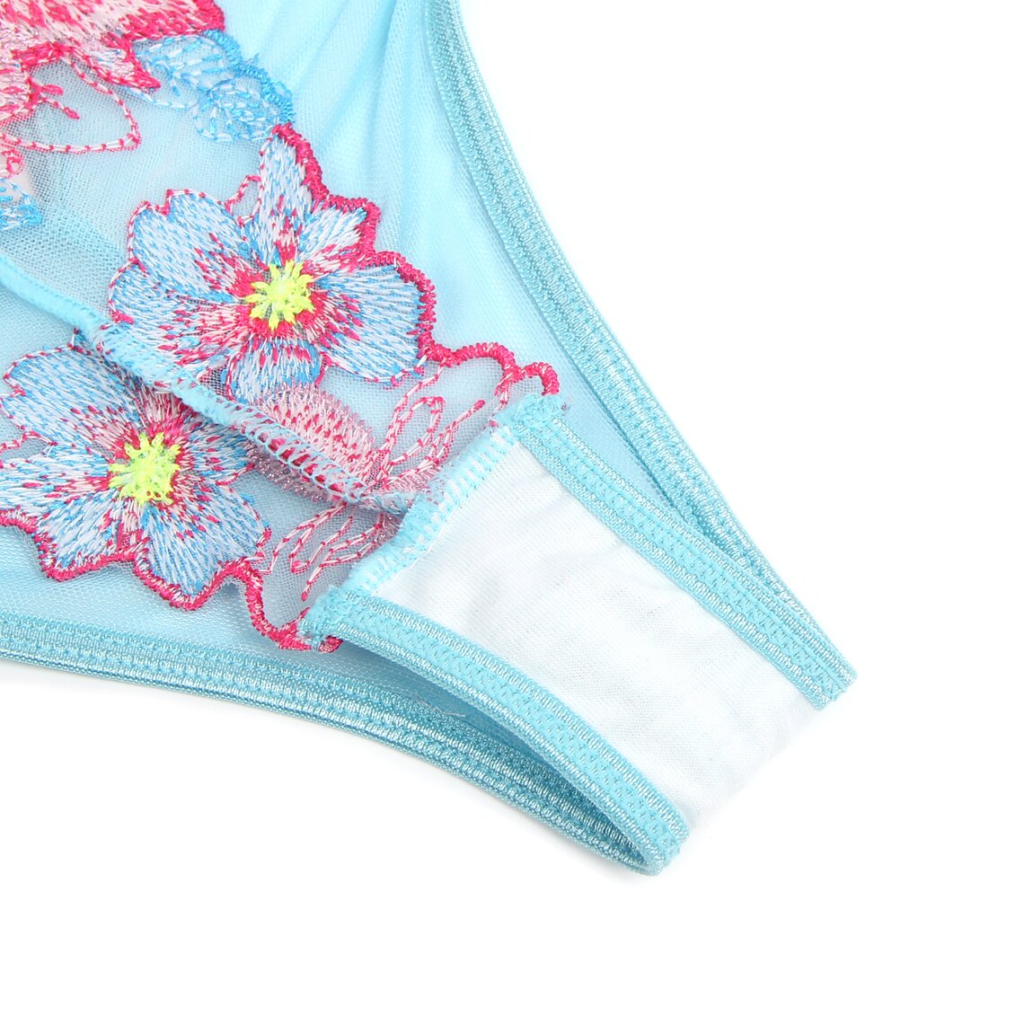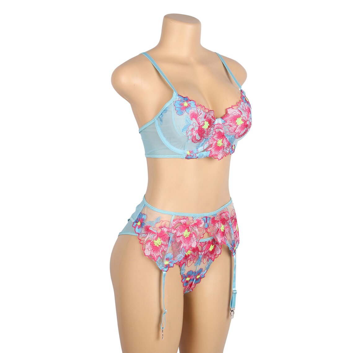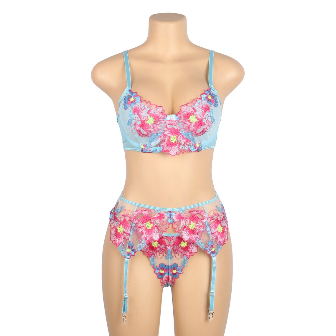 Delicado conjunto de lencería que combina romanticismo y sensualidad con un diseño floral muy elegante. Este conjunto de Subblime incluye sujetador, liguero y braguita a juego, confeccionados en tejido semitransparente en tono verde agua y adornados con llamativos bordados florales en tonos rosa y azul que realzan la silueta con un estilo sofisticado.