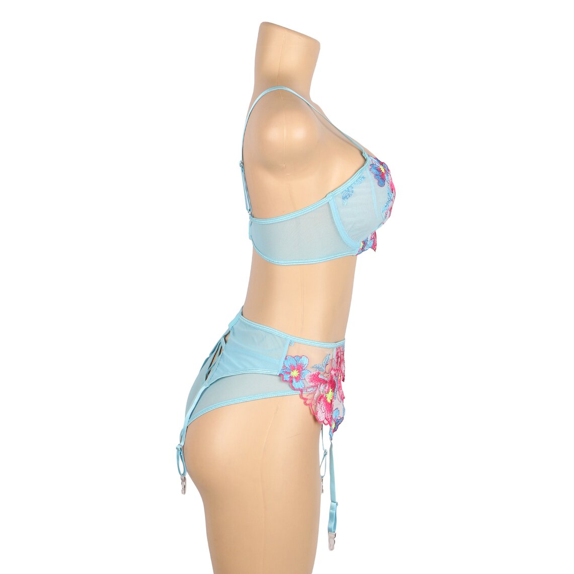 Conjunto de lencería con sujetador, liguero y braguita con bordados florales